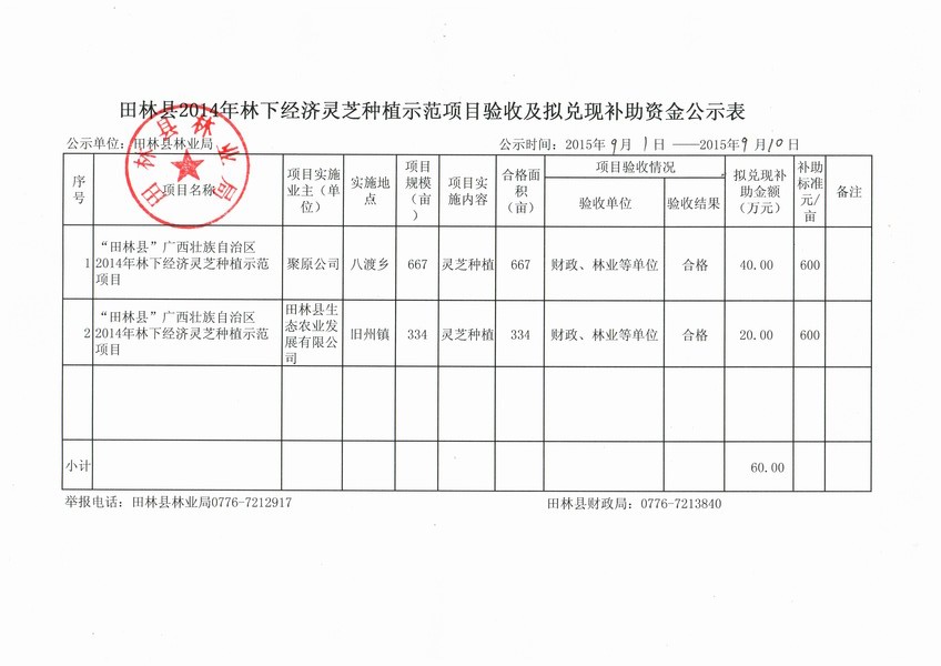 田林县2014年林下经济灵芝种植示范项目验收及拟兑现补助资金公示表