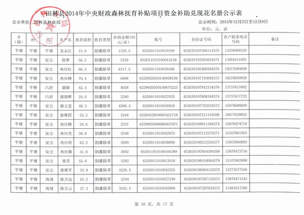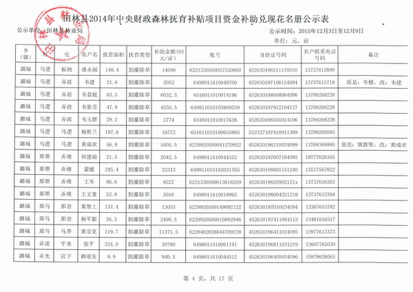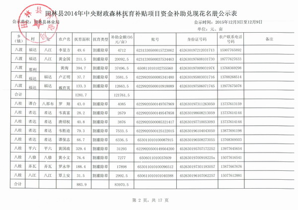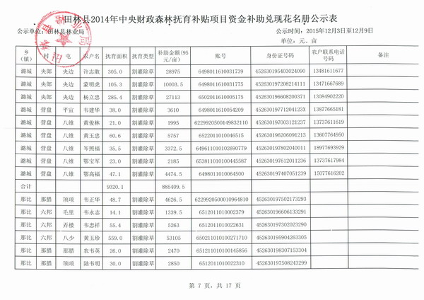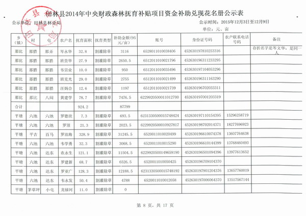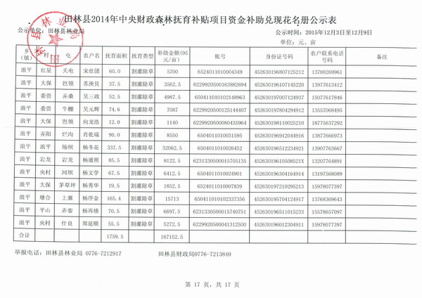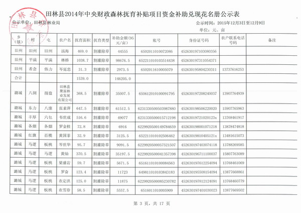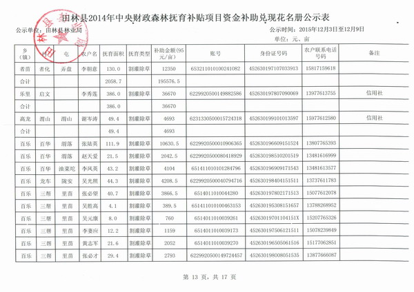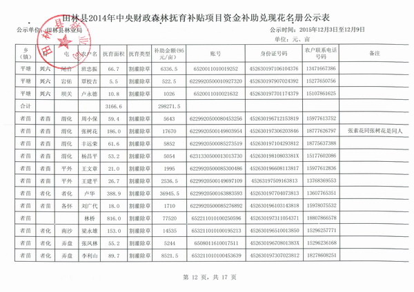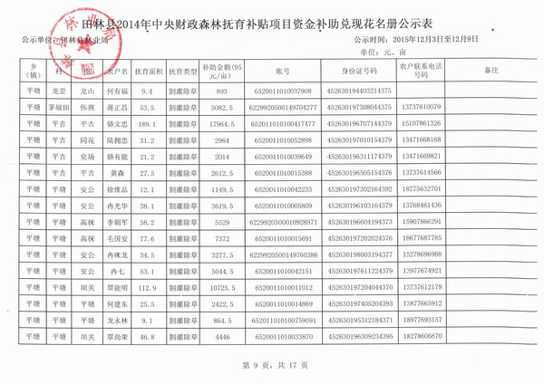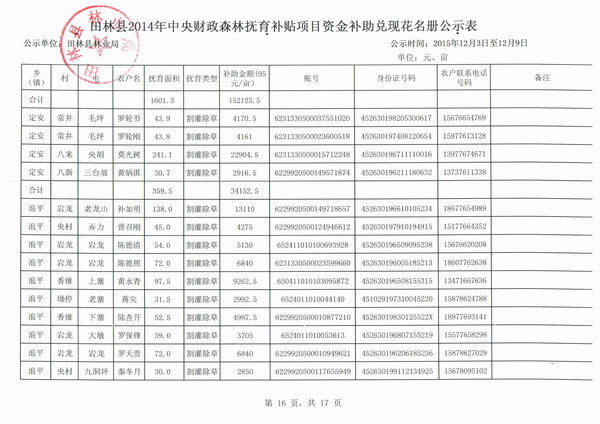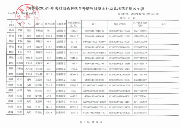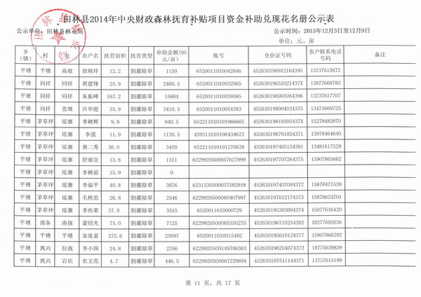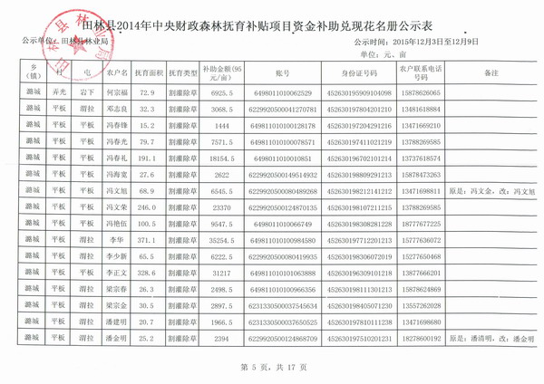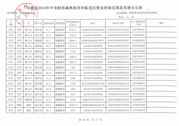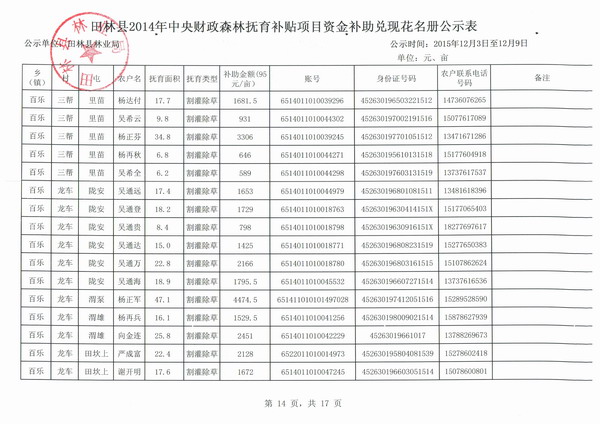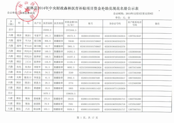 田林县2014年中央财政森林抚育补贴项目资金补助兑现花名册公示表